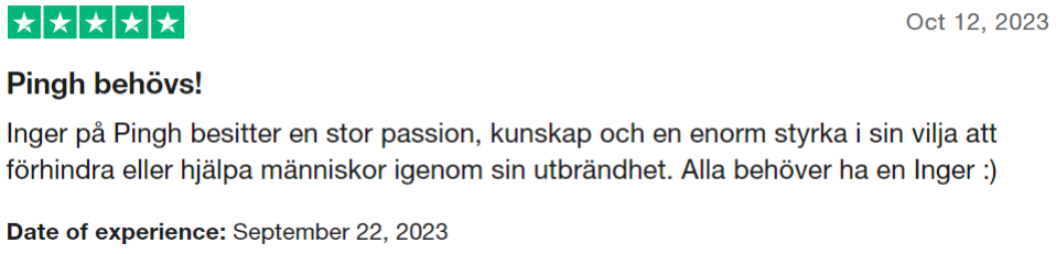 Inger är lyhörd och kompetent. I Pinghs utbud kan du bl a finna Ingers microkurser, som passar väl för ett företag/arbetsplats att ha med som en del i sitt förebyggande arbetsmiljöarbete. Kurserna fungerar både för den skeptiske och den som redan vet att liknande arbete verkligen fungerar.
